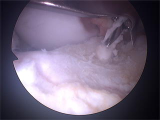 - Entfernung von "Plicae" (Falte der inneren Gelenkhaut/Synovia) und freier Gelenkfragmente.